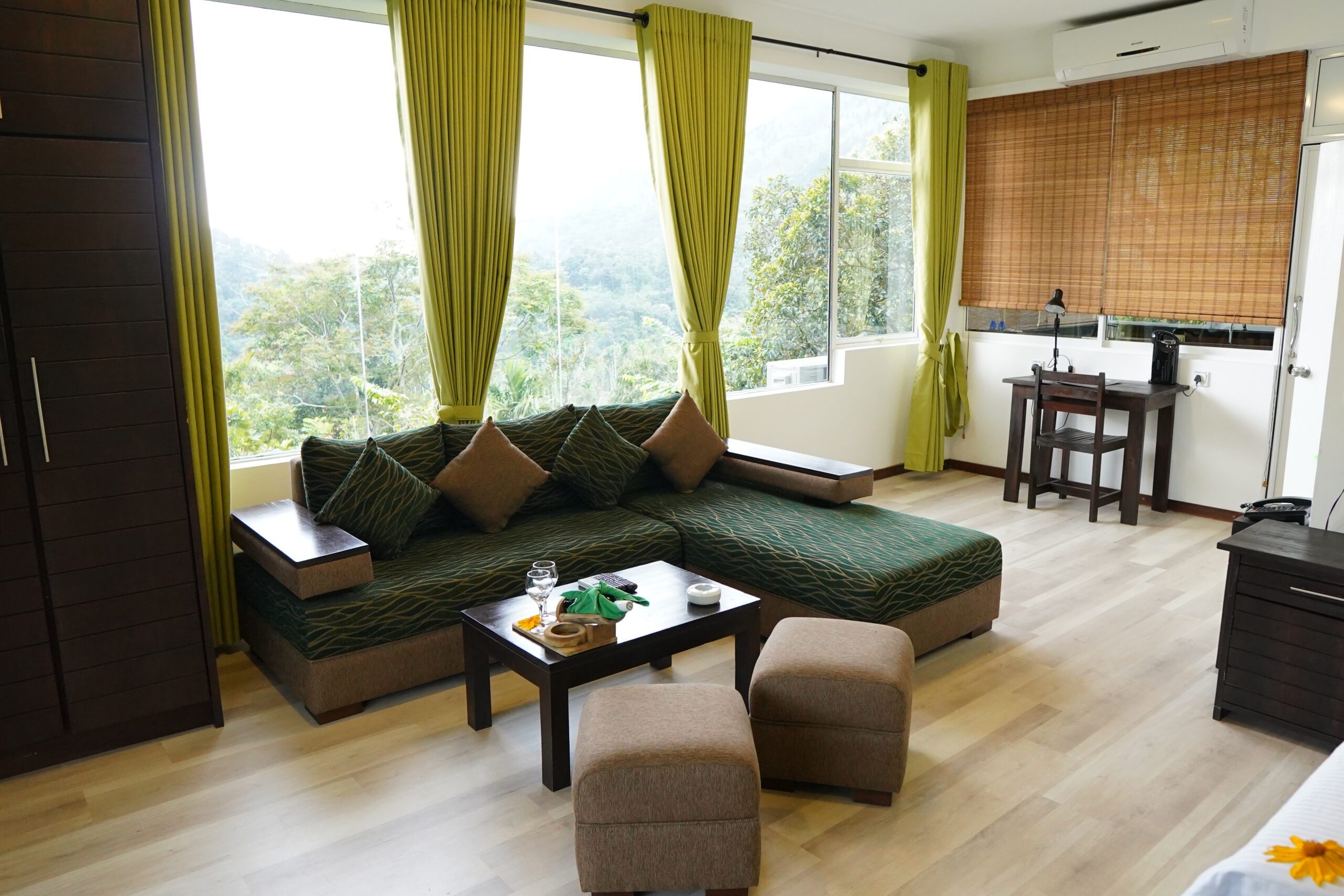 This spacious modern suite with tiled floors, a separate tea/coffee pantry and a bathroom with a single jacuzzi, blends luxury with stillness and natural charm. With a large outdoor wooden deck overlooking panoramic Horton Plains Mountain Range with the river flowing about a 30 meters down , this is a complete package to feel at home while relaxing.