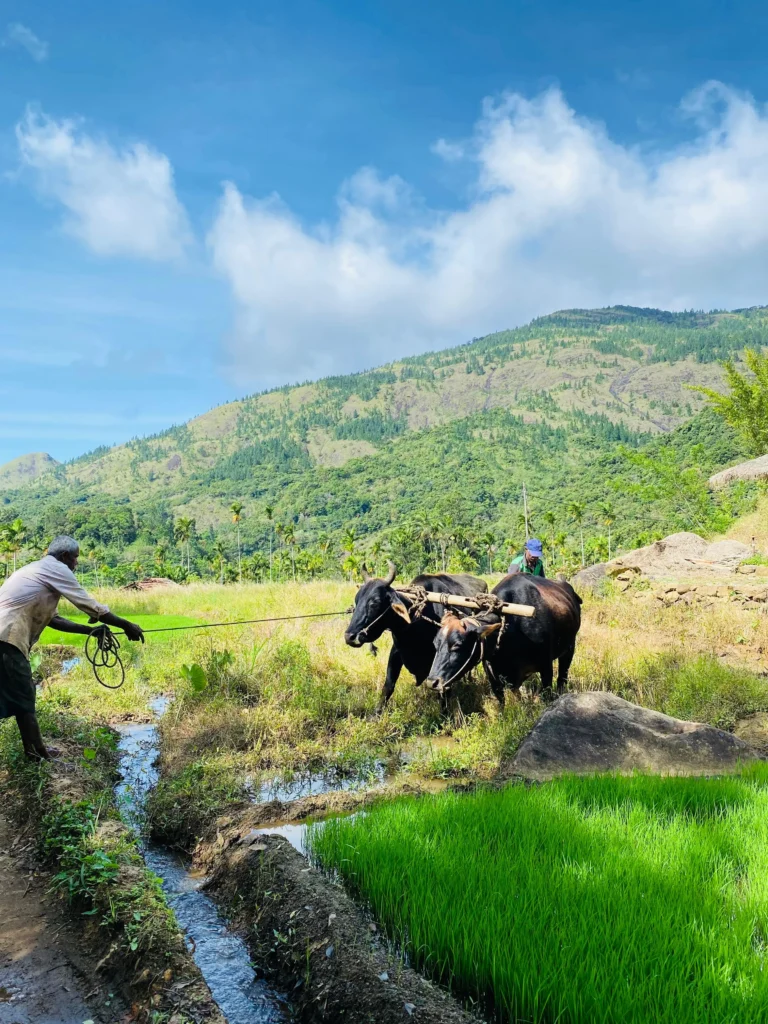 Two bullocks move steadily through the wet paddy field, guided by experienced hands, showing the quiet rhythm of traditional farming.